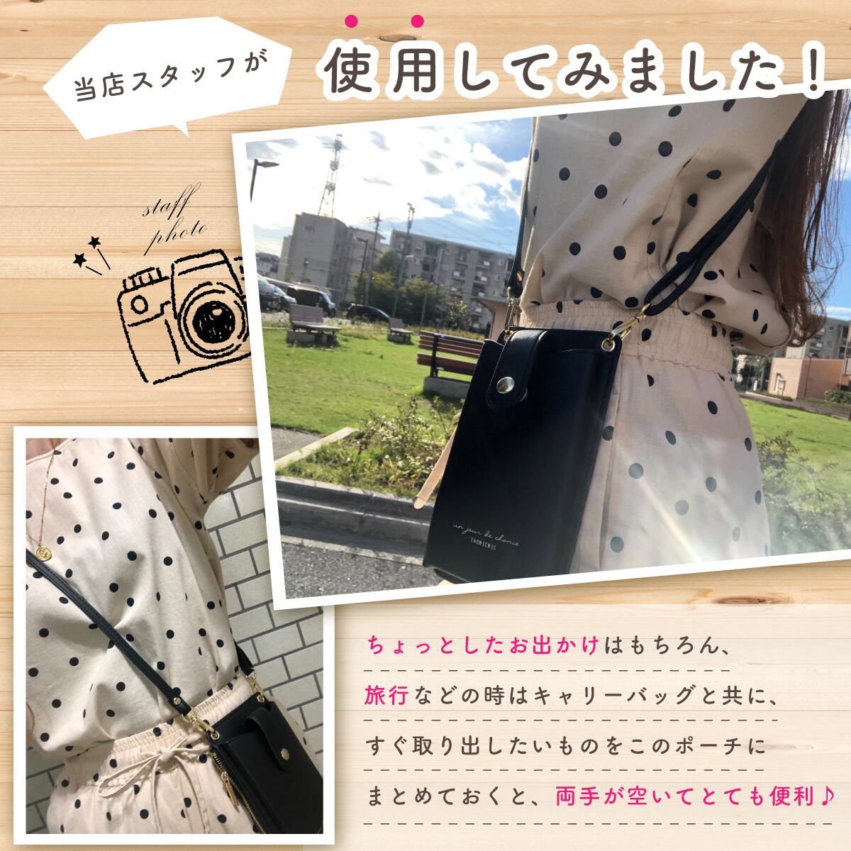 マグネットボタンのフタ付きでスマホが落ちないので安心。ちょっとしたお出かけに最適