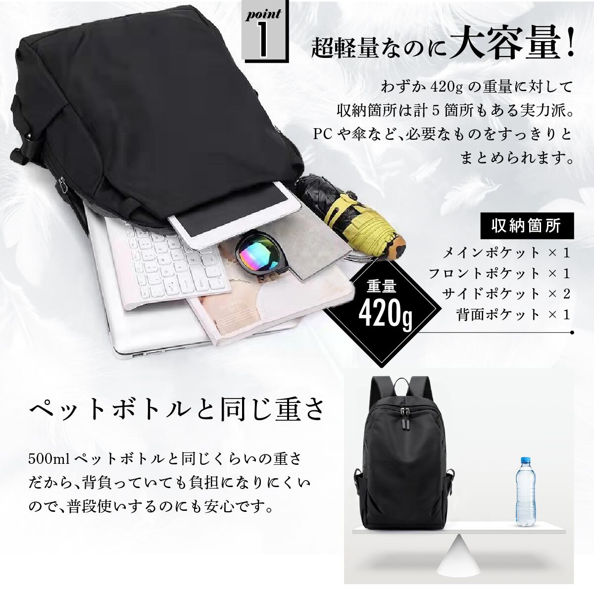 500mlのペットボトルよりも軽い420gで、軽々と背負えます。